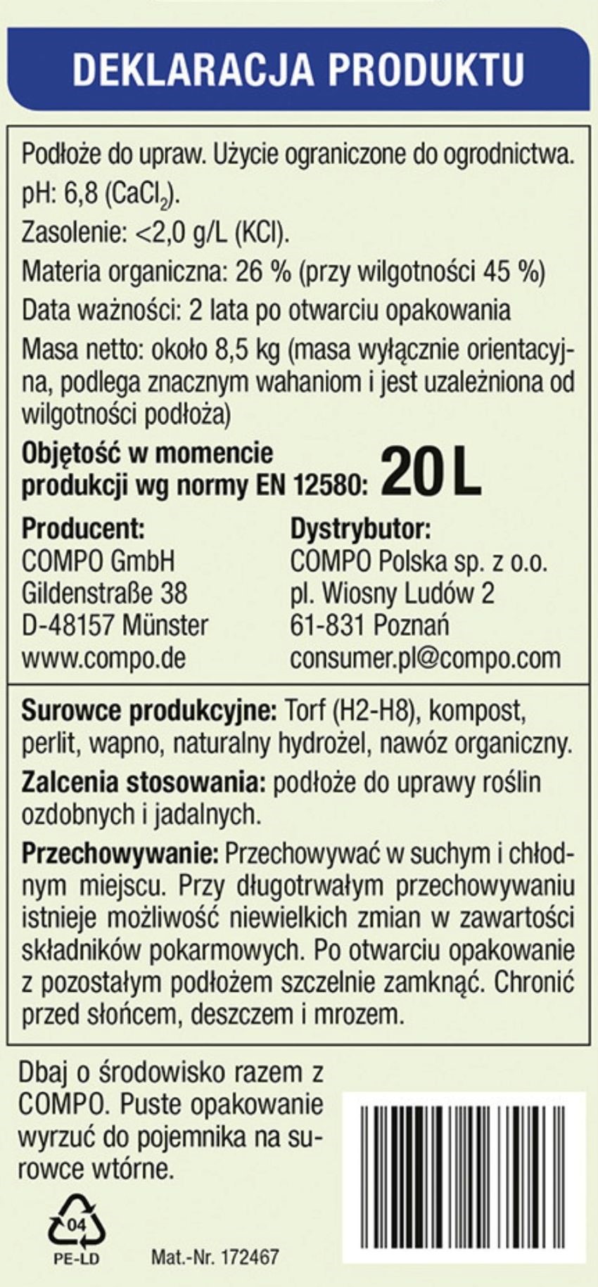Podłoże należy przechowywać w suchym i chłodnym miejscu. Chronić przed słońcem, deszczem i mrozem.