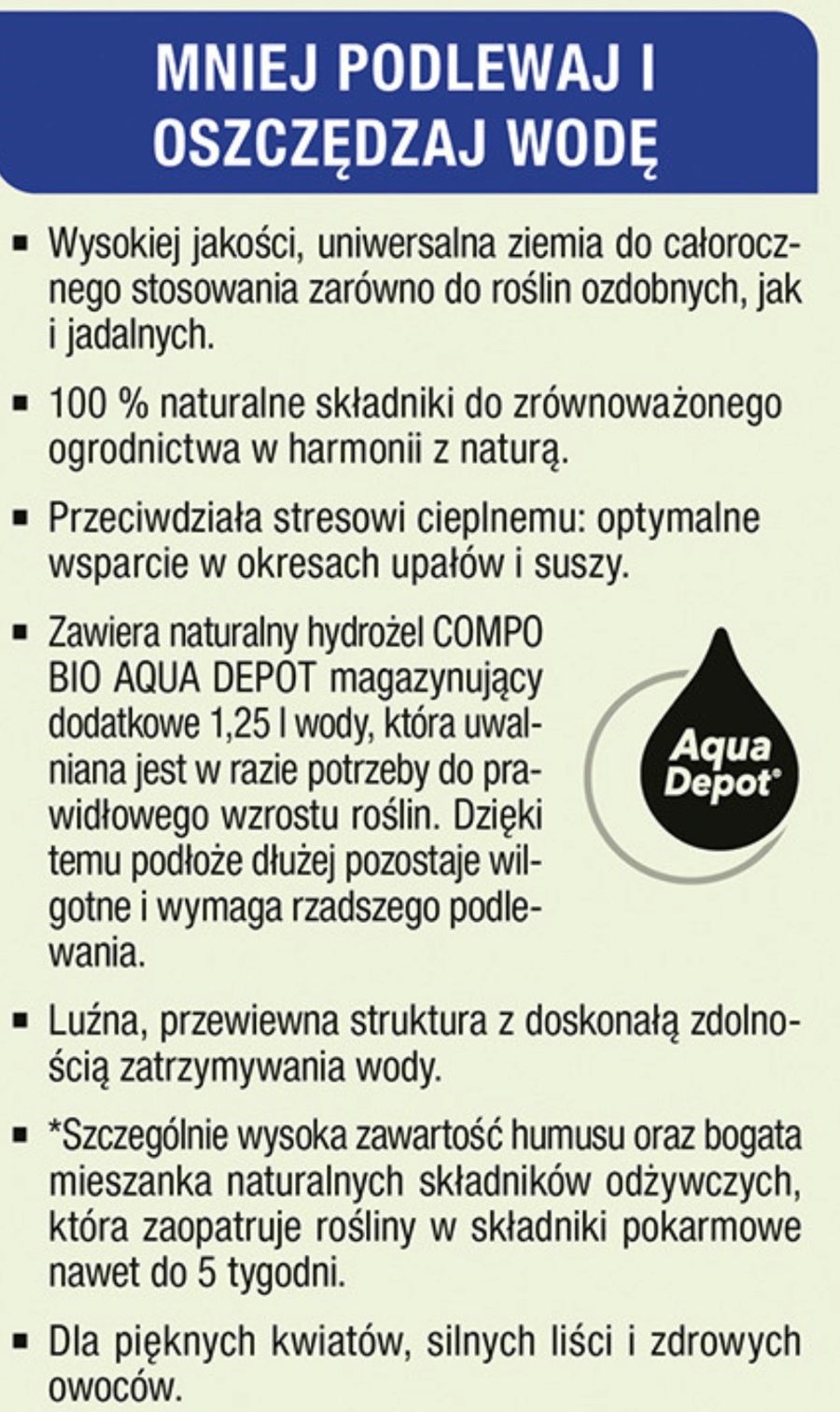 Uniwersalną ziemię COMPO BIO AQUA DEPOT® można stosować do wszystkich roślin ozdobnych, owocowych, warzywnych oraz ziół. Zoptymalizowane zaopatrzenie w składniki odżywcze oraz wysoka zawartość kompostu zapewniają im doskonały wzrost.