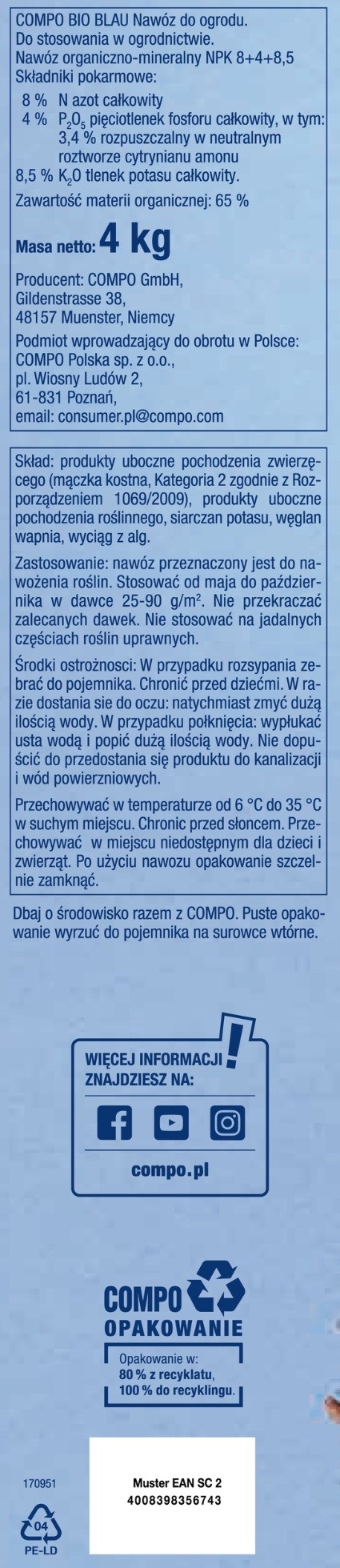 Bio Blau to uniwersalny nawóz w formie granulatu, w 100% ekologiczny nie zawierający żadnych sztucznych dodatków. Naturalne składniki zawarte w nawozie przyczyniają się do poprawy żyzności oraz odbudowy warstwy próchnicznej gleby. Można go stosować do warzyw, owoców i roślin ozdobnych. Doskonałe rezultaty daje zastosowanie tego nawozu do nowych nasadzeń oraz podczas przesadzania roślin.