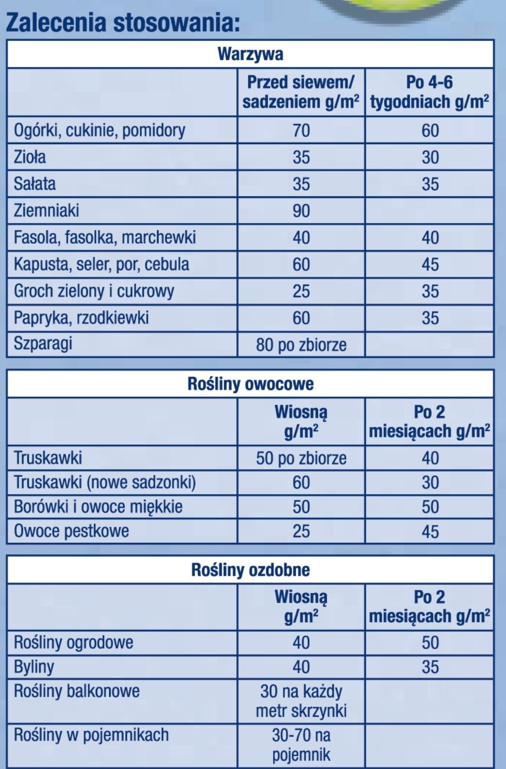 - ogórki, cukinie pomidory - przed siewem 70g / m2, po 4–6 tygodniach 60g / m2