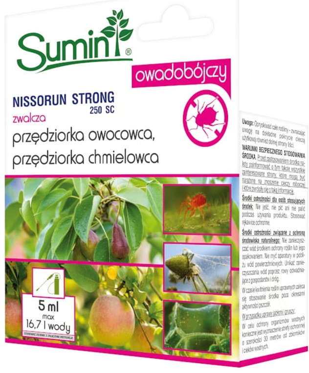 Nissorun Strong 250 SC środek przędziorkobójczy w formie koncentratu w postaci stężonej zawiesiny do rozcieńczania wodą, o działaniu kontaktowym i żołądkowym, przeznaczony do zwalczania wszystkich stadiów rozwojowych przędziorków z wyjątkiem osobników dorosłych w uprawach roślin warzywnych i owocowych.