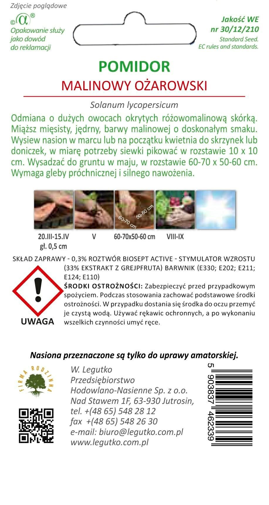 Pomidor gruntowy (Solanum lycopersicum) 'Malinowy Ożarowski' jest odmianą wczesna, wysoko rosnącą, do uprawy przy palikach. Owoce niezwykle atrakcyjne, kształtne o pięknej malinowej barwie. Miąższ mięsisty, jędrny o doskonałym smaku. Nasiona są zaprawiane.